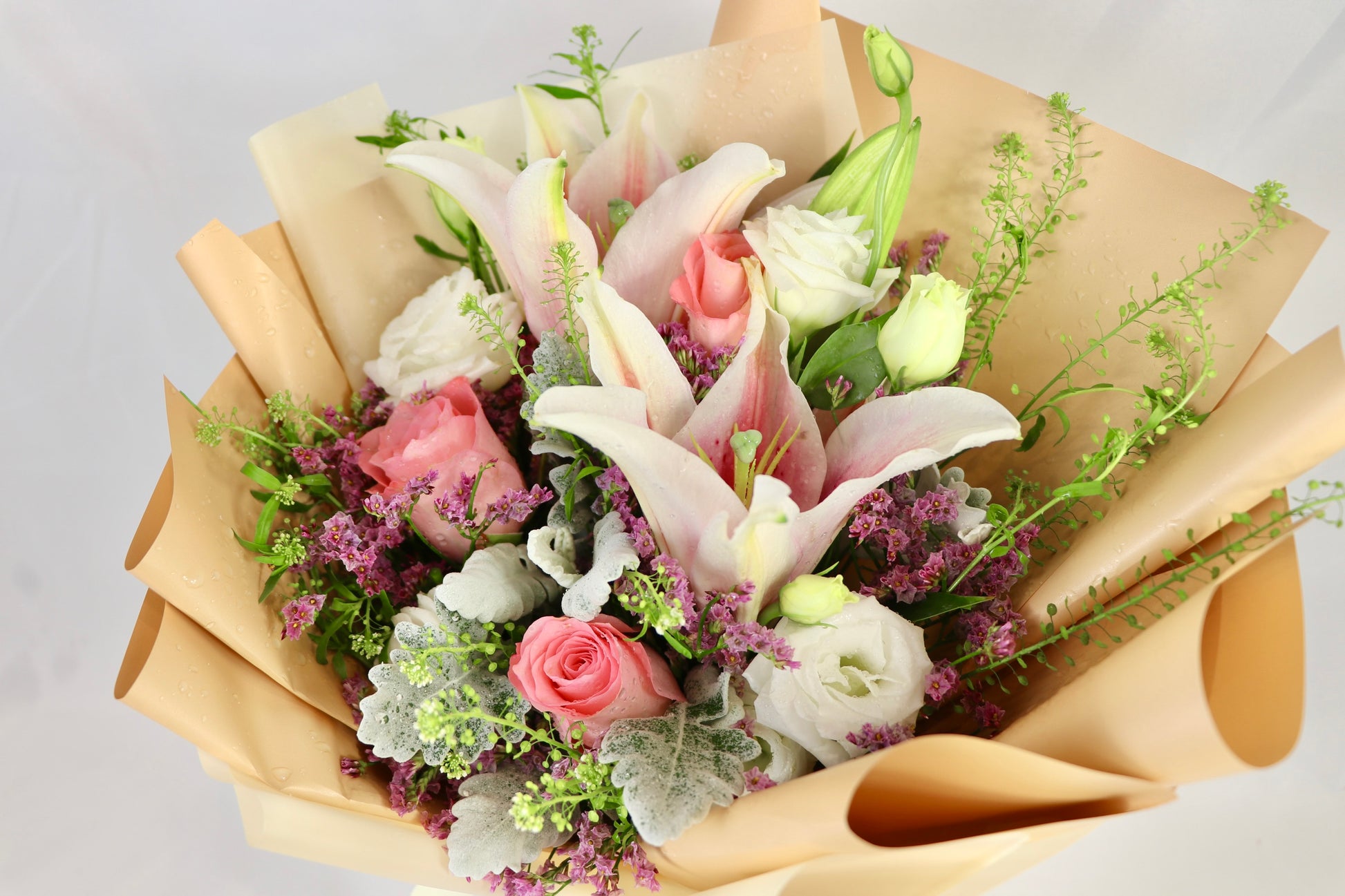 This lovely combination of pink and white flowers, hedged by delicate yet verdant greens, is refreshing to look at whilst being aromatically pleasing. Put a spring in someone's step with this cheerful bouquet.