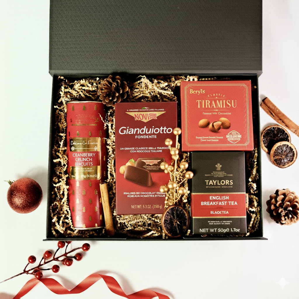 Unwrap the joy of the season with our Holiday Magic gift box. A delightful ensemble featuring velvety tiramisu milk chocolate-coated almonds by Beryl’s, festive biscuits in a charming Christmas tube by heritage baker Grandma Wild’s, a rich English Breakfast tea blend from Taylors of Harrogate, and luxurious Italian chocolate pralines from Novi that melt in your mouth with every bite.