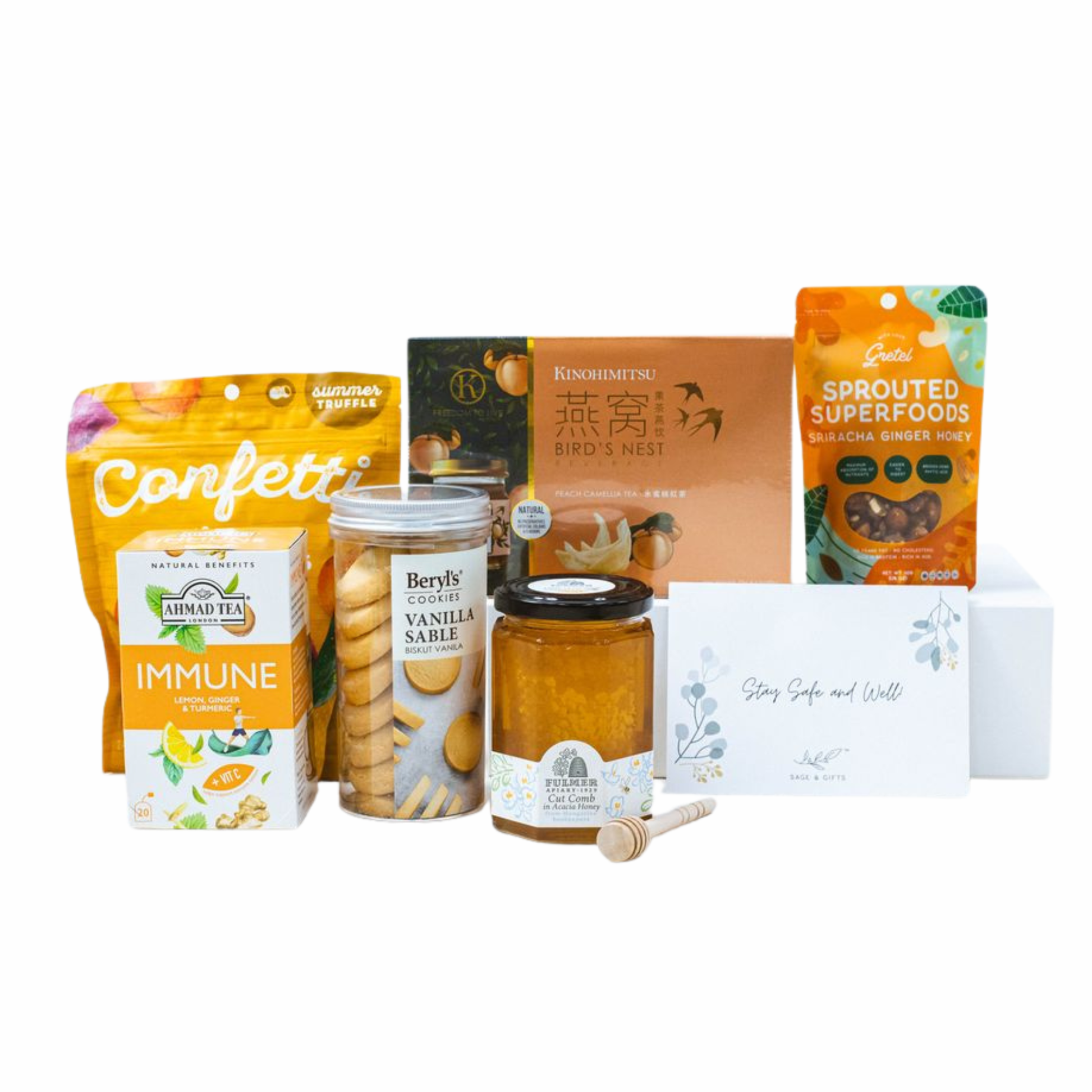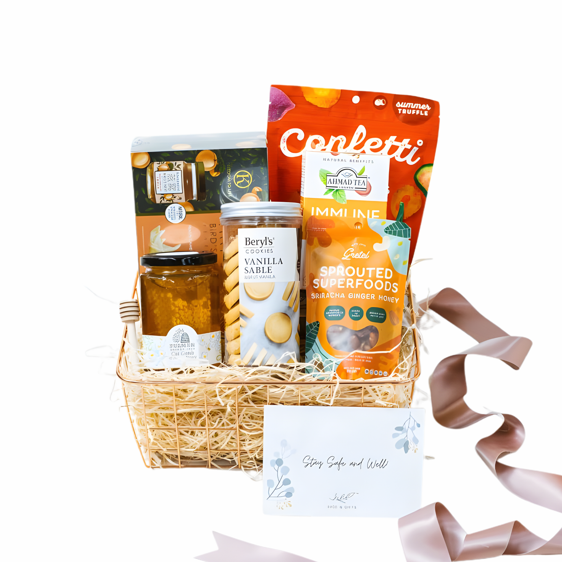 A get well soon hamper basket featuring nutrient and anti-oxidant rich items including Buram's Cut Comb honey, delicious handcrafted sable cookies, Ahmad Tea's Immune that is packed with antioxidants and your choice of a premium box of Kinohimitsu tonic to restore health.