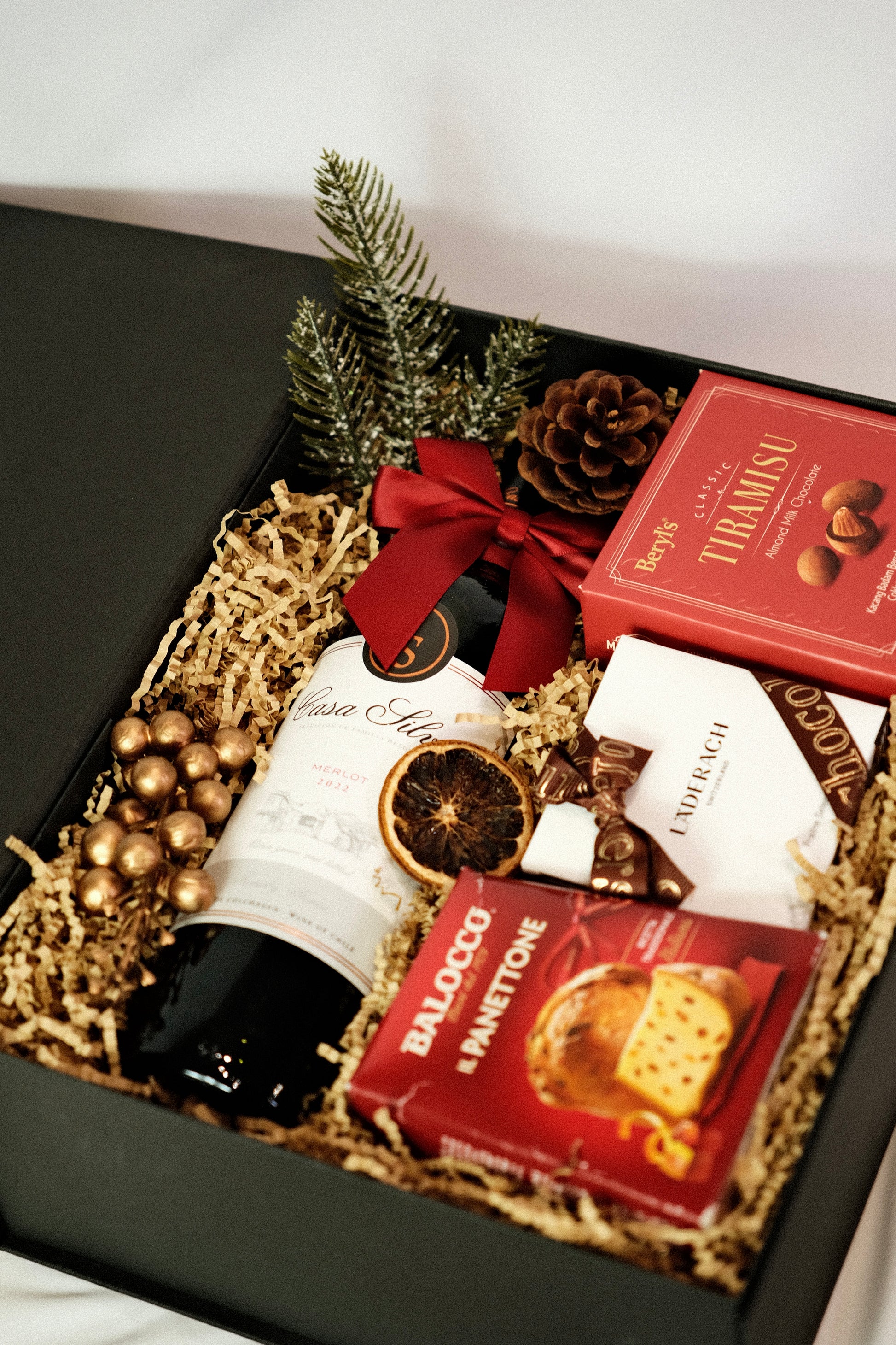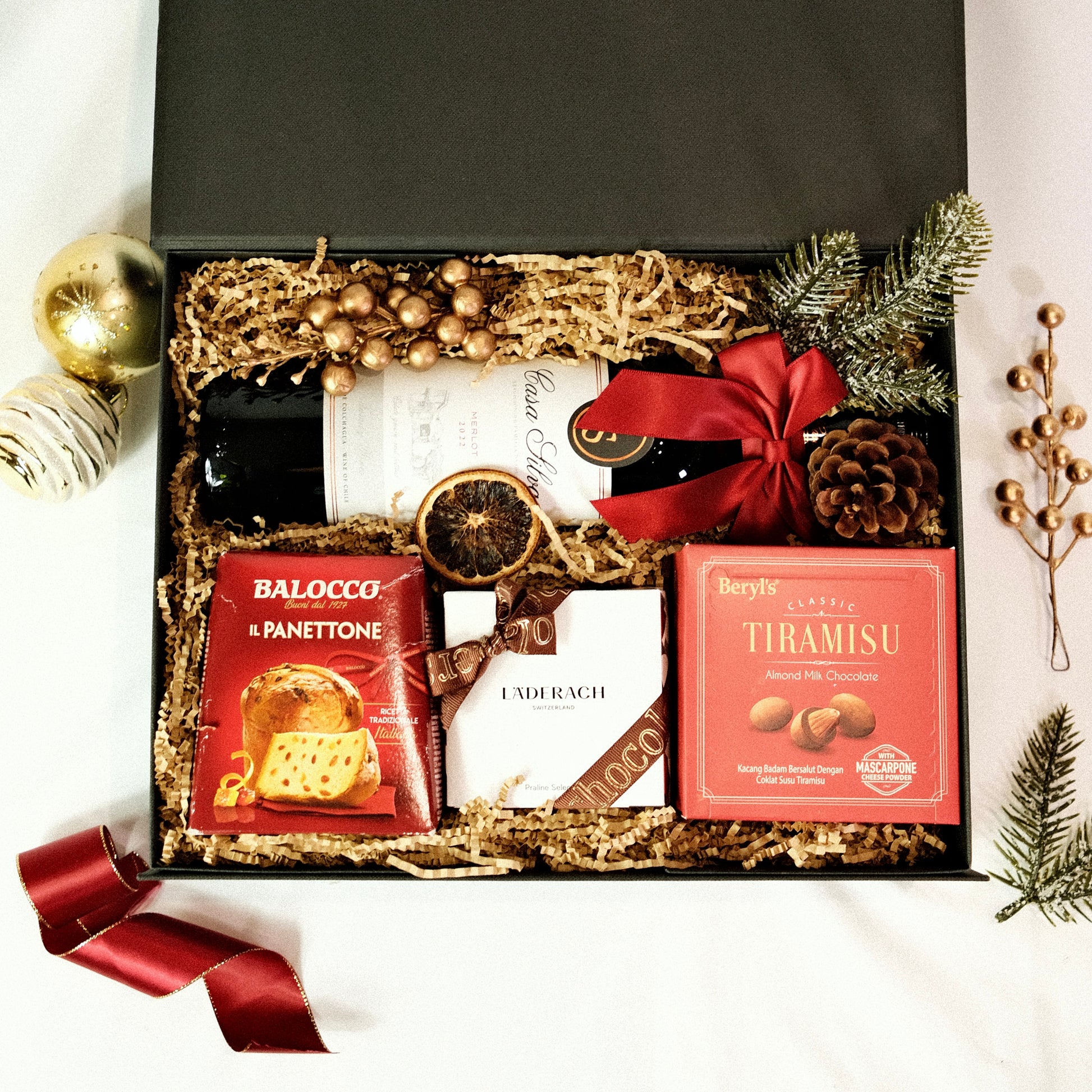 Celebrate the festive season with this ensemble of sweet treats, featuring delectable chocolates from Laderach and Beryl's, a rich, classic panettone, and buttery Shortbread House of Edinburgh cookies. A fruity, full-bodied merlot by Casa Silva completes the collection.