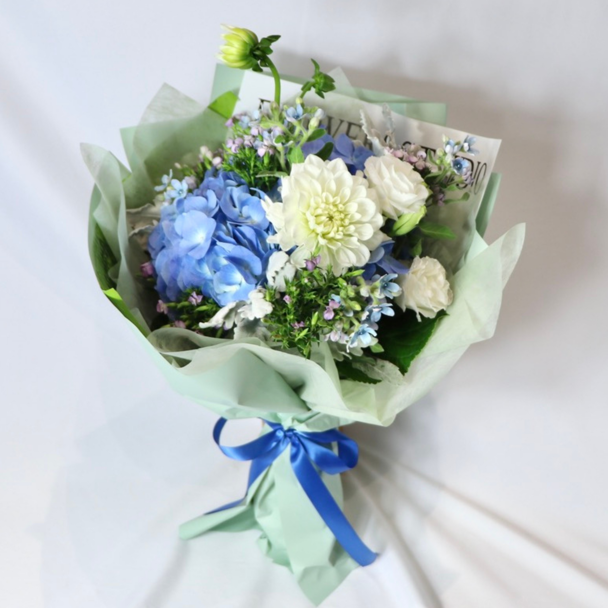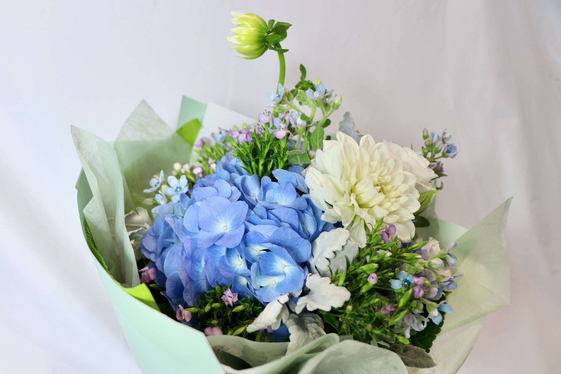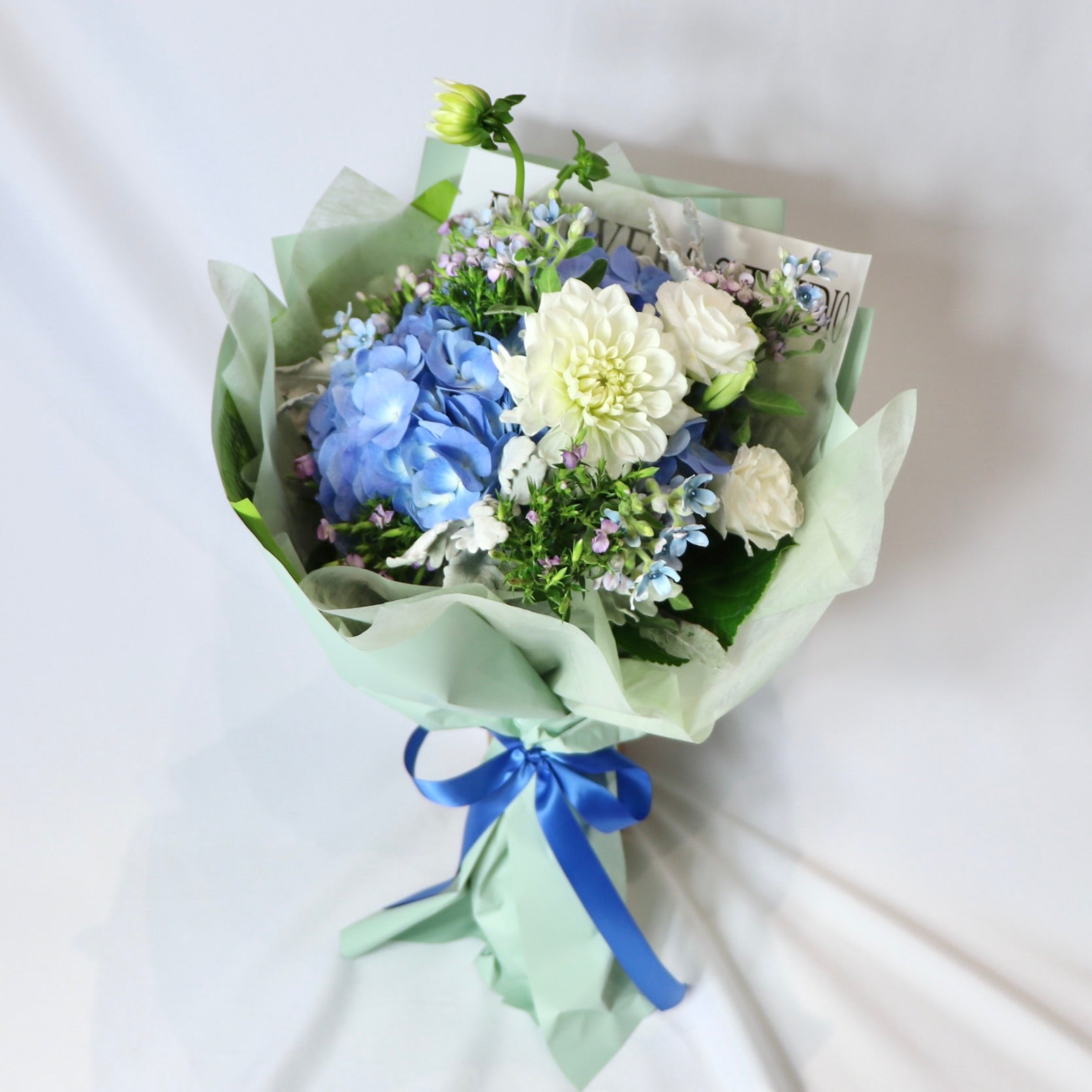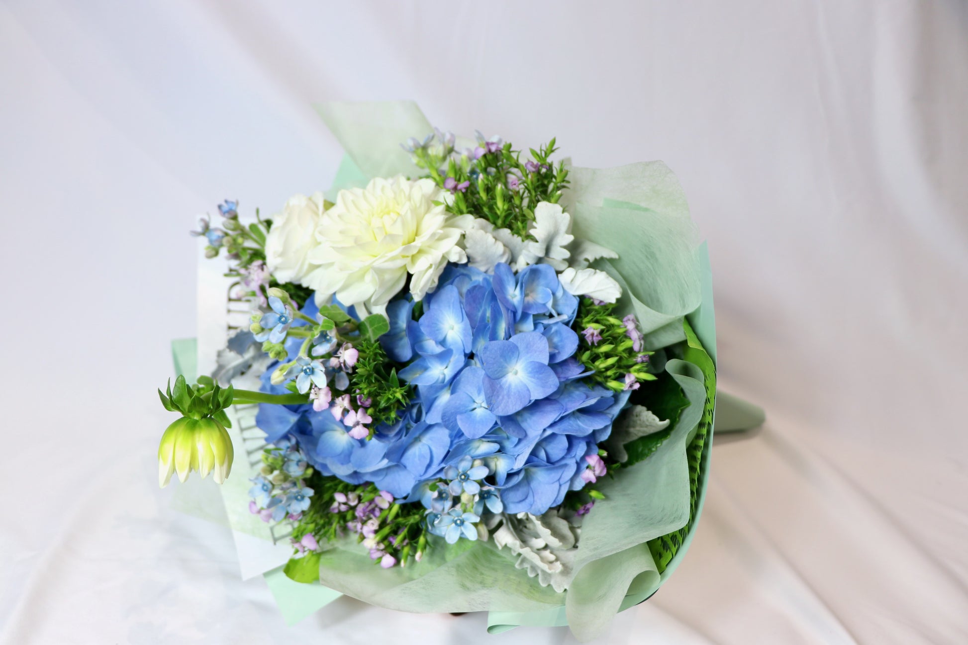 Mary's Garden features a graceful blend of soft blue hydrangeas and delicate white roses, offering a serene and elegant arrangement perfect for bringing a peaceful touch to any space.