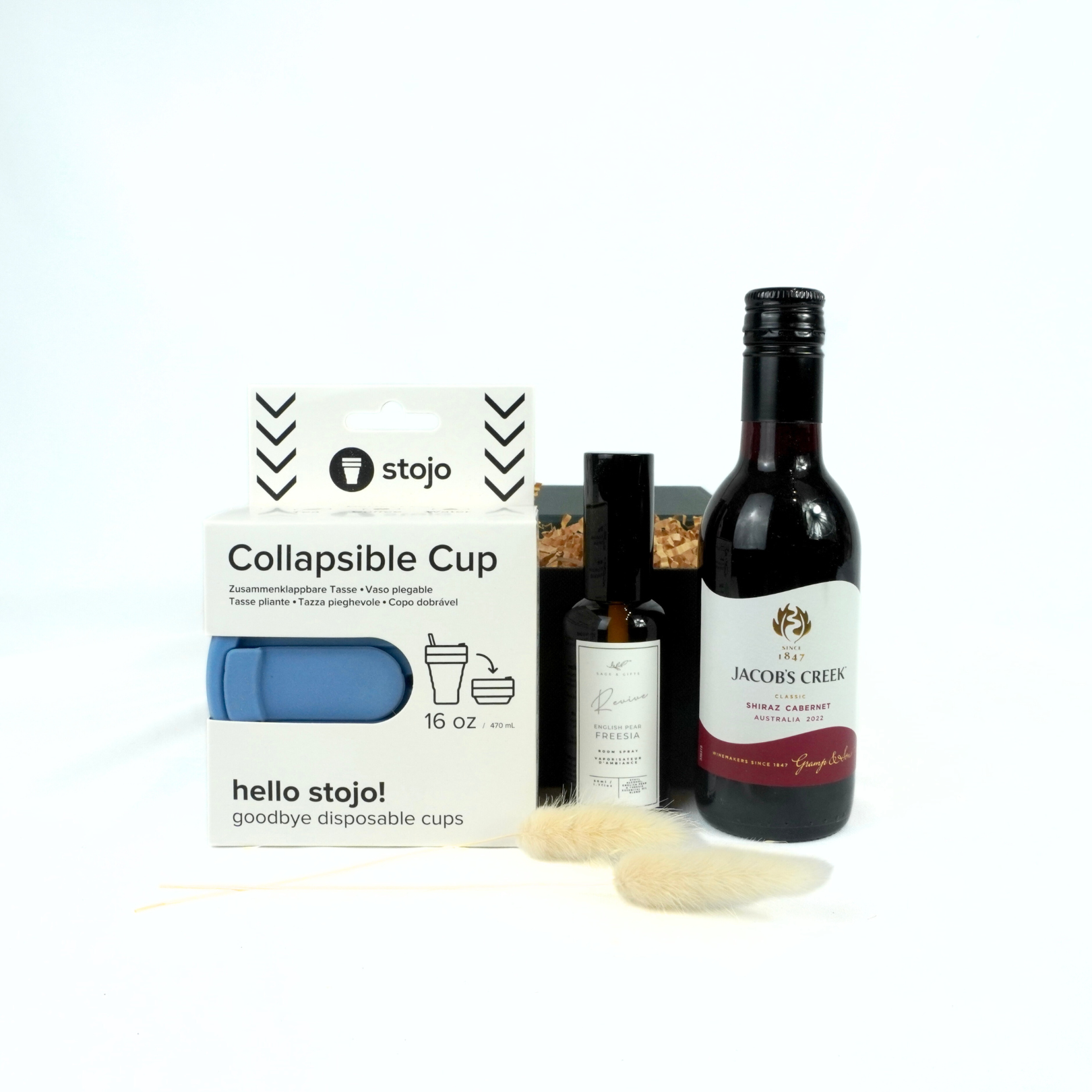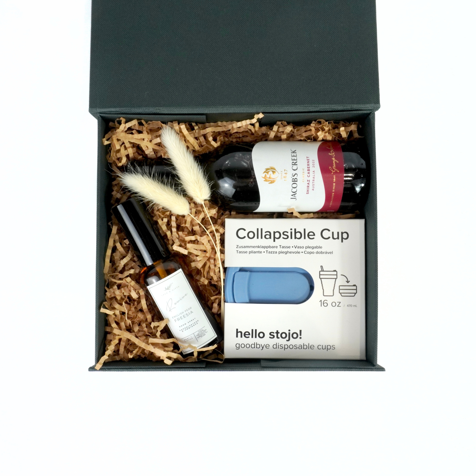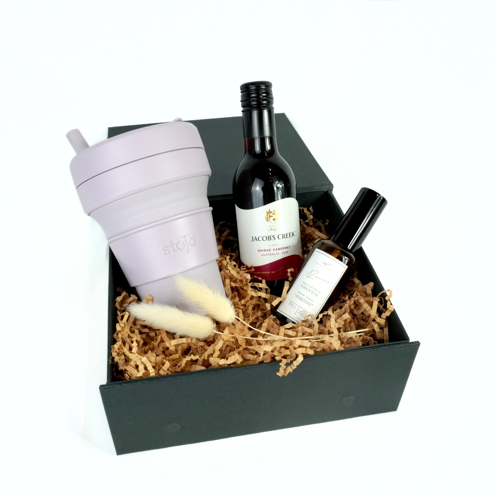 Sometimes, all you need is a little something to hit pause. The Mini Escape is a compact curation of simple pleasures designed to bring a moment of calm to a busy day. This sleek black gift box features a collapsible Stojo cup for coffee on the go, a mini bottle of Jacob’s Creek wine to toast to the little wins, and a refreshing room spray to instantly uplift any space. Thoughtful, stylish, and easy to enjoy — it’s the perfect pick-me-up for anyone who deserves a quick getaway, even if just for a moment.