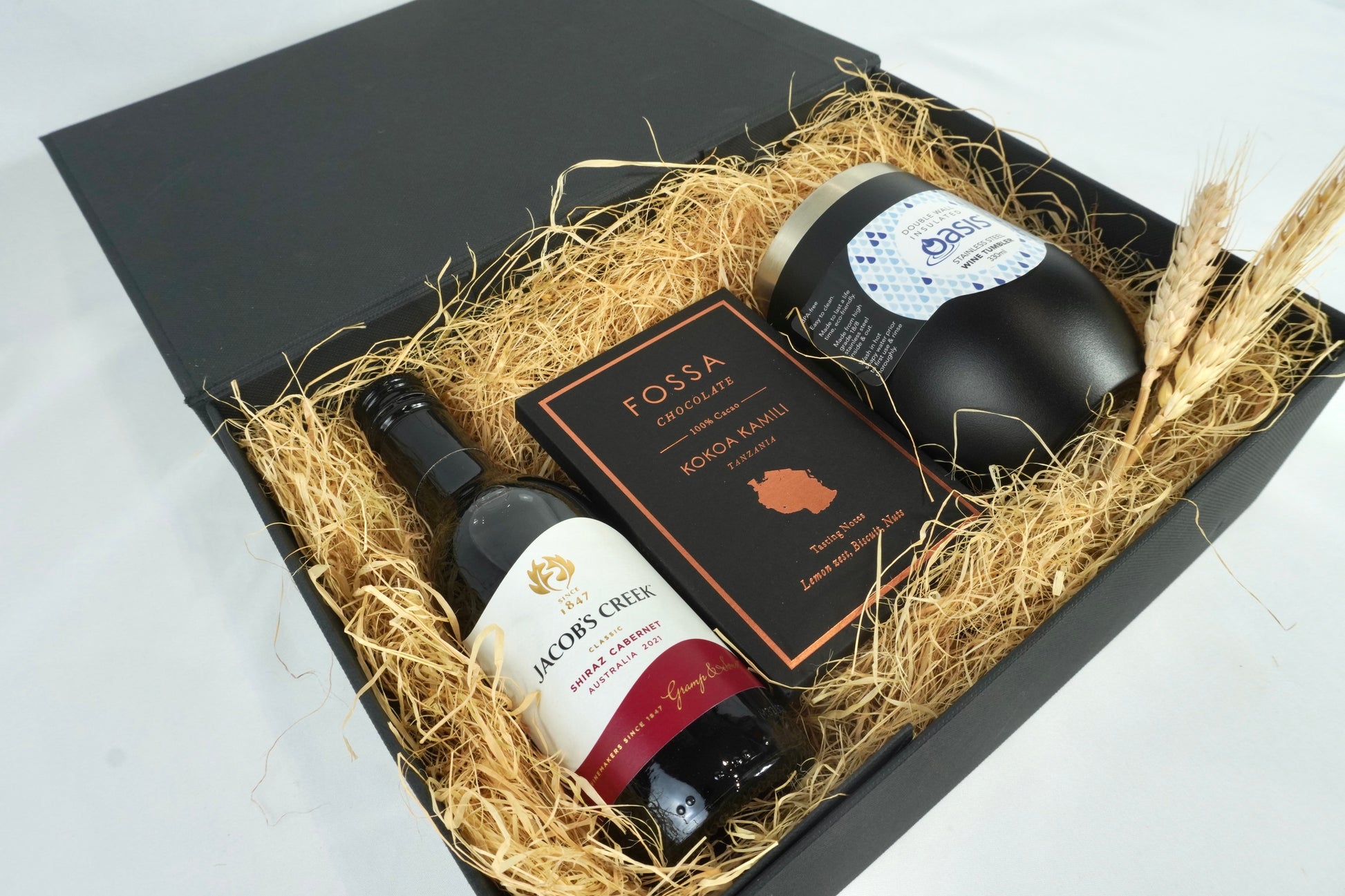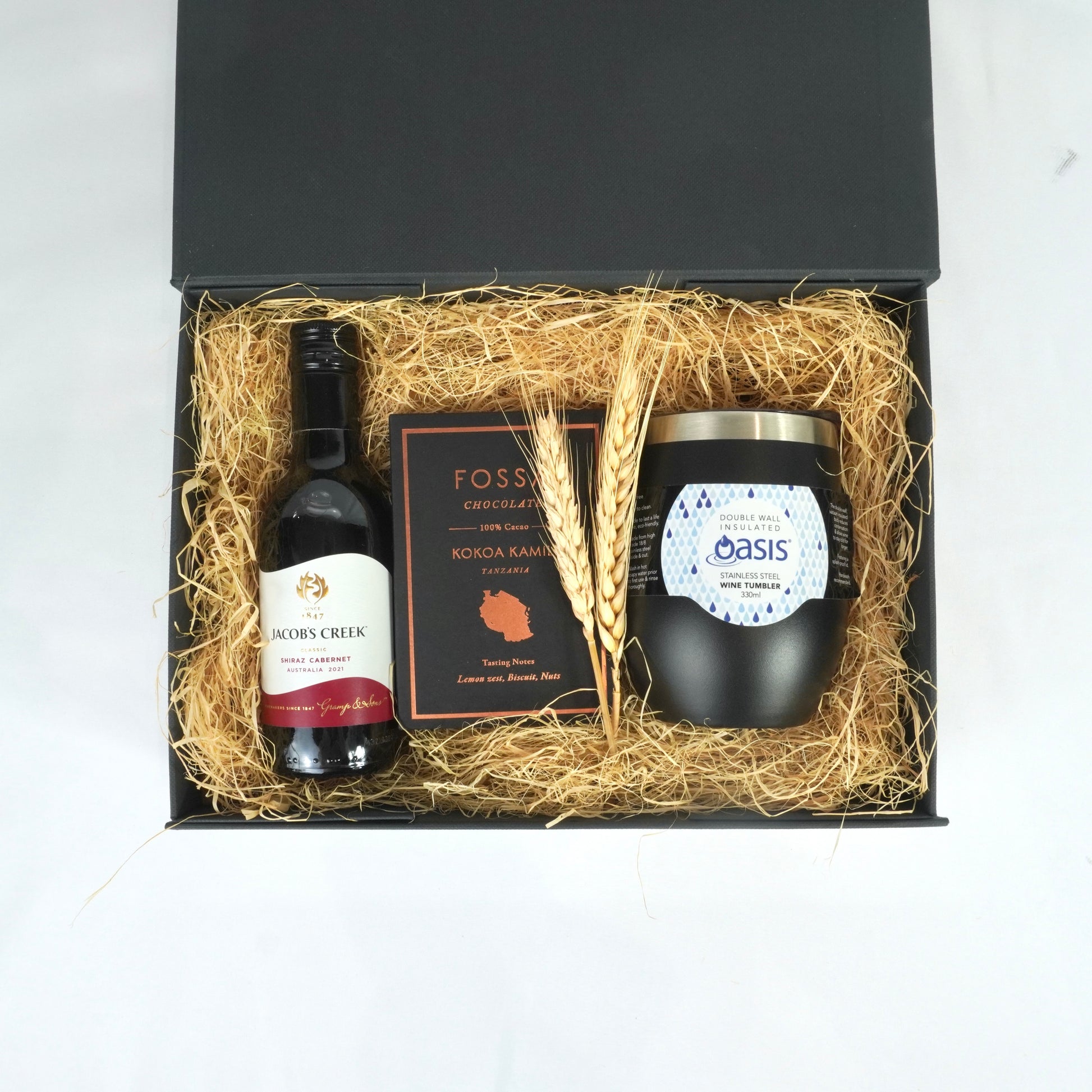 A sophisticated collection for refined indulgence. Featuring a mini bottle of wine, our sleek Oasis wine tumbler, and exquisite Fossa Dark Chocolate for a moment of pure bliss.