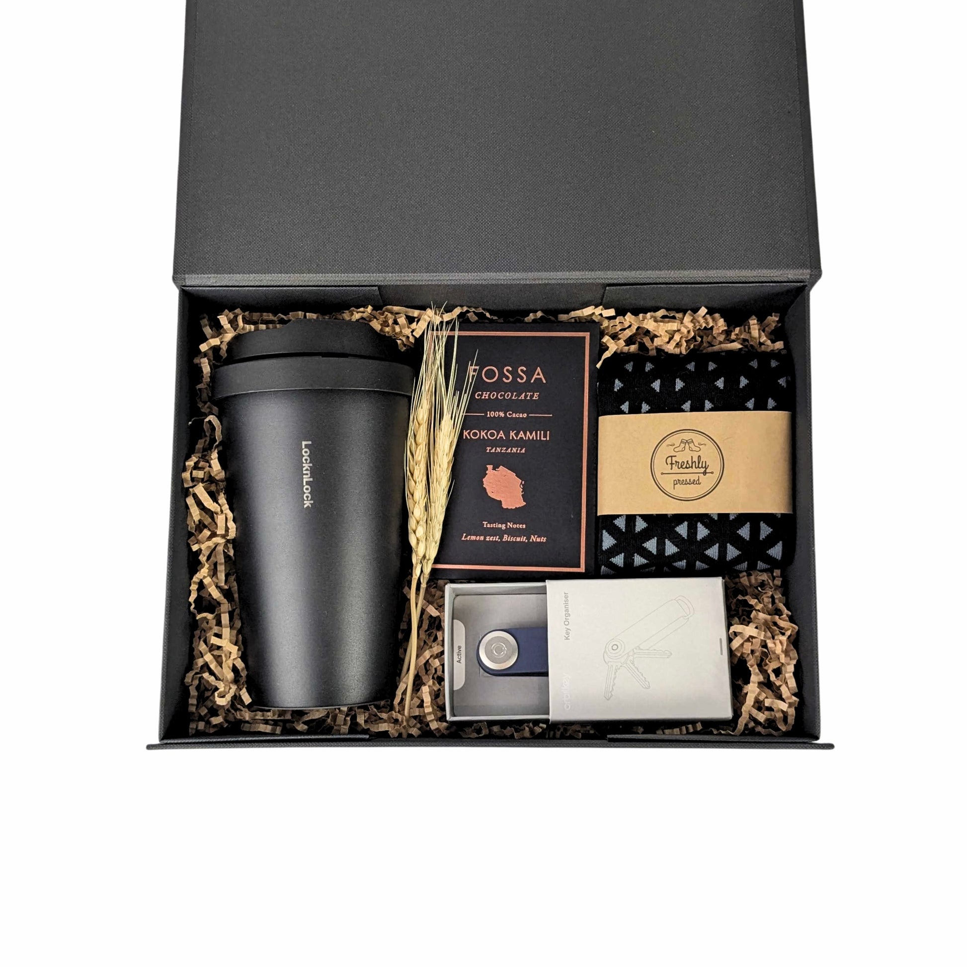 A versatile monochrome gift box that looks so sleek! A stylish award-winning key organiser by Orbitkey made from soft, highly durable polymer TPU that will stand the test of time, a pair of creatively designed socks from homegrown brand Freshly Pressed Socks, premium 100% cacao bean-to-bar chocolate by local brand Fossa Chocolate, and a choice of an insulated stainless steel coffee cup from LocknLock or an insulated wine tumbler from Oasis make this gift set à la mode!