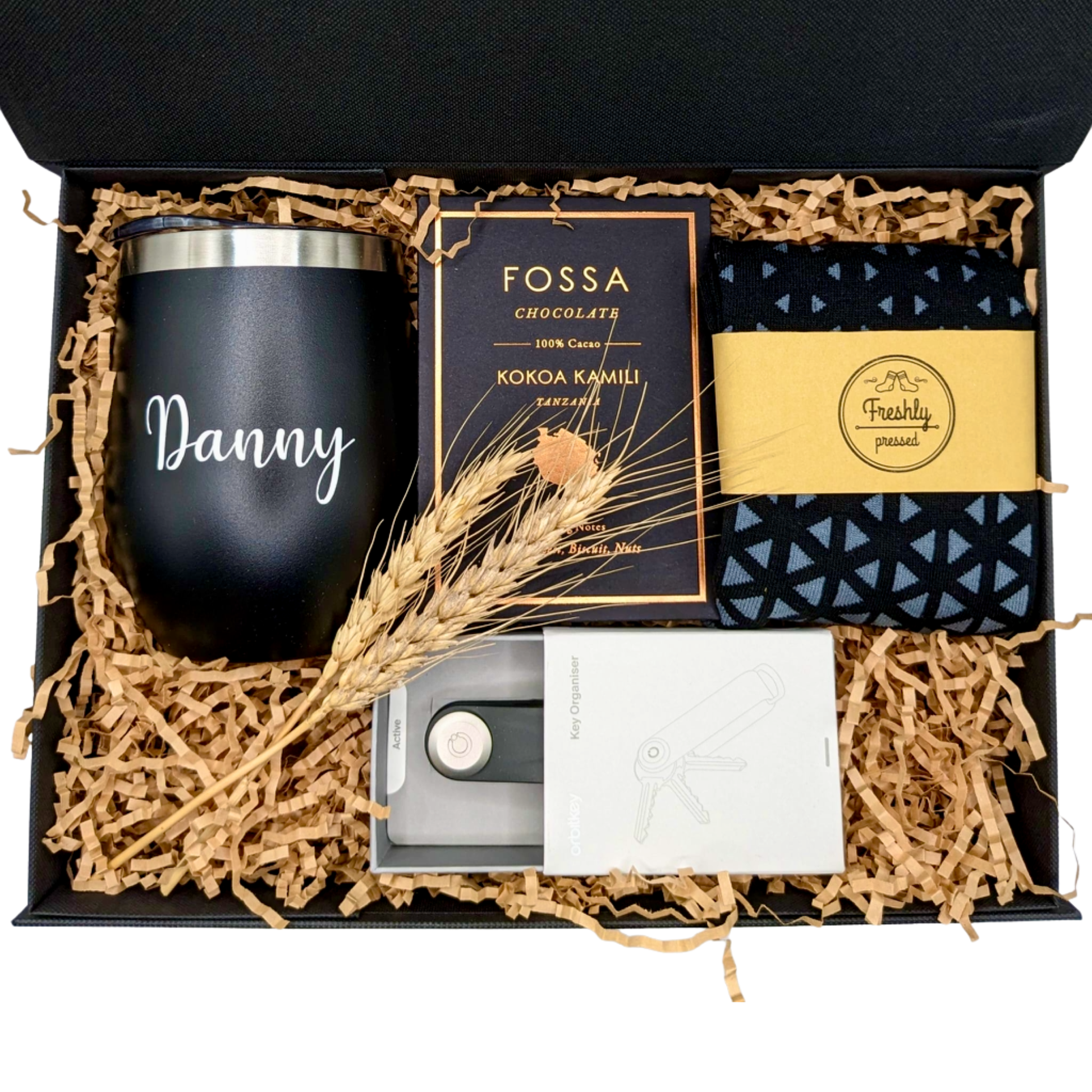 A versatile monochrome gift box that looks so sleek! A stylish award-winning key organiser by Orbitkey made from soft, highly durable polymer TPU that will stand the test of time, a pair of creatively designed socks from homegrown brand Freshly Pressed Socks, premium 100% cacao bean-to-bar chocolate by local brand Fossa Chocolate, and a choice of an insulated stainless steel coffee cup from Bincoo or an insulated wine tumbler from Oasis make this gift set à la mode!